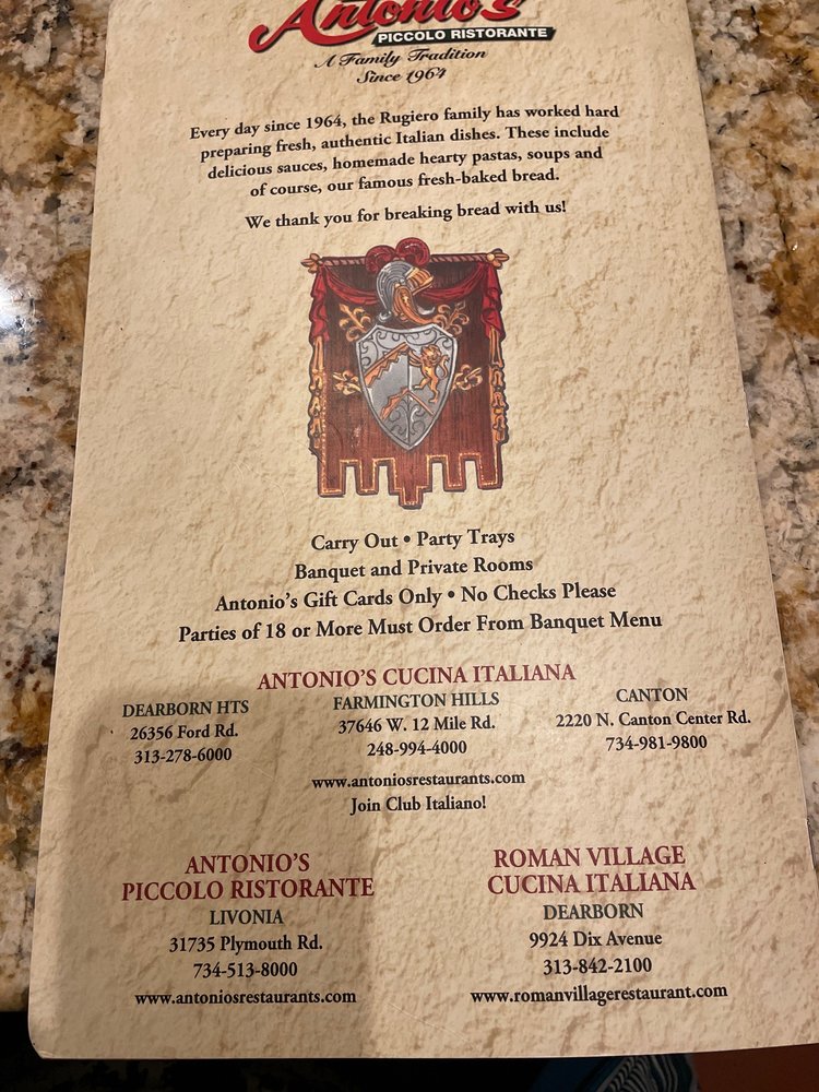 Antonio's Piccolo Ristorante, located in Livonia, MI, is a charming Italian restaurant that offers a variety of dining options. The menu features an array of vegetarian dishes, making it a great choice for those with dietary restrictions. The restaurant has a classy yet casual ambiance, perfect for both intimate dinners and group gatherings. With amenities like private dining, outdoor seating, and a full bar, Antonio's provides a fantastic dining experience. The attentive waitstaff and delicious food options make this restaurant a must-visit. Don't miss out on trying their signature dishes and enjoying the cozy atmosphere at Antonio's Piccolo Ristorante. Make a reservation today to experience Italian cuisine at its finest.