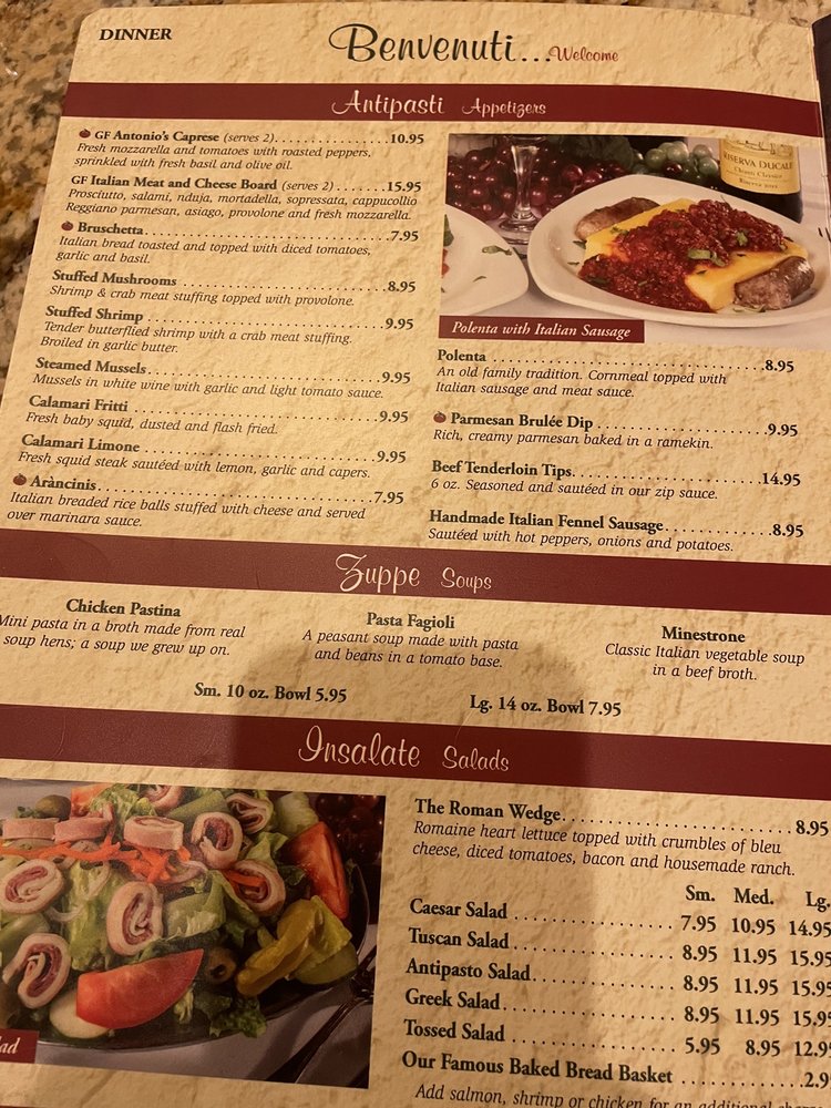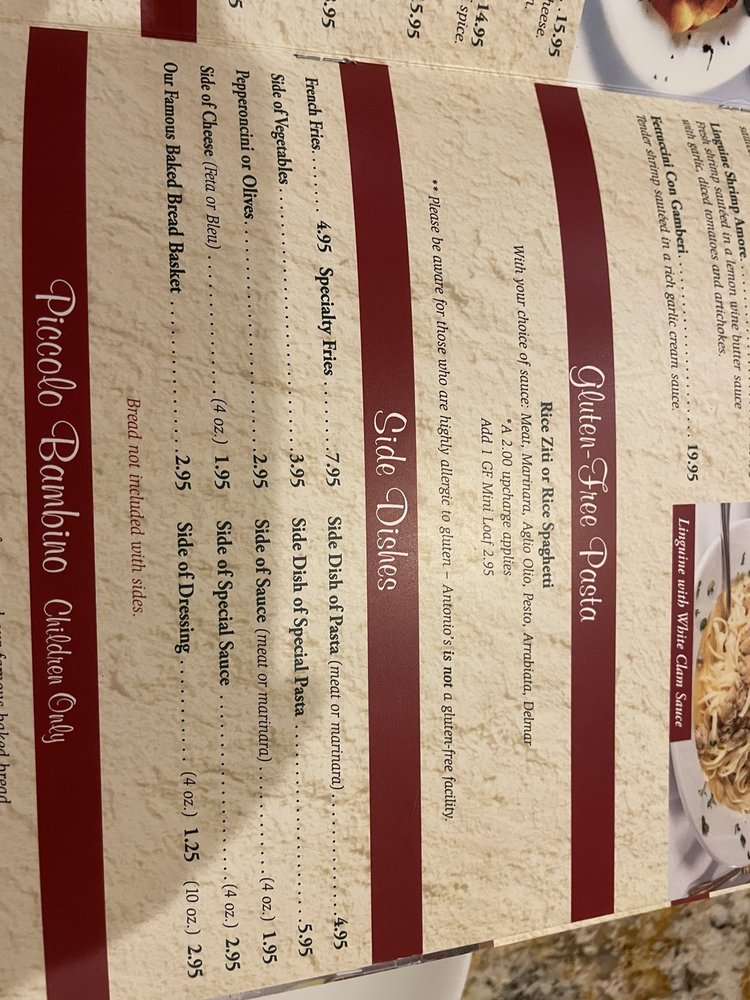 With your choice of sauce: Meat, Marinara, Aglio Olio, Pesto, Arrabiata, Delmar. A $ upcharge applies. Add GF Bread Basket $. Please be aware for those who are highly allergic to gluten – Antonio's is not a gluten-free facility.